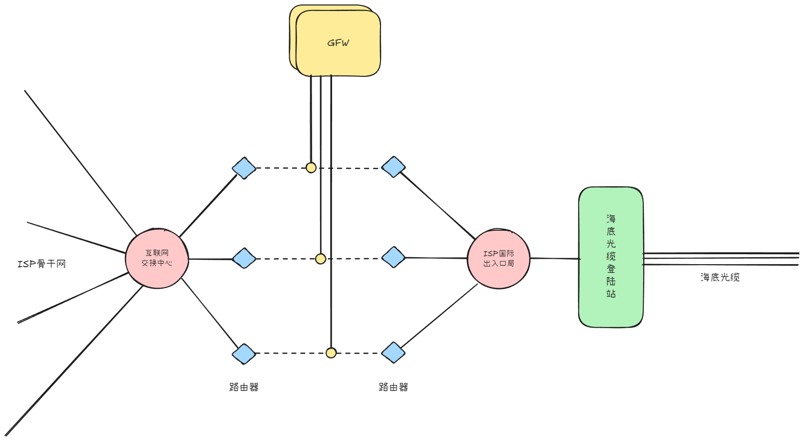 关于 GFW 的架构,我想除了网信办的相关人员,外人都难以知晓。但有一种广泛流传的架构方式如下图: