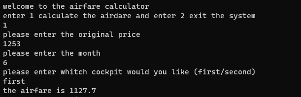 System.out.println("enter 1 calculate the airdare and enter 2 exit the system");