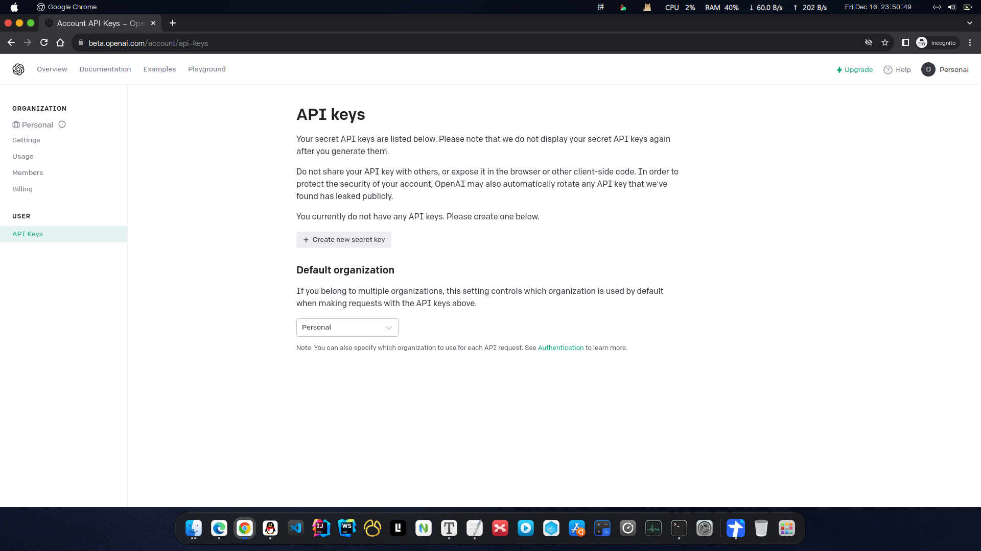 选择左侧的 “API keys”,点击 “Create new secret key”,获取 API 密钥,记得要保存好,页面关闭后将无法再查看。