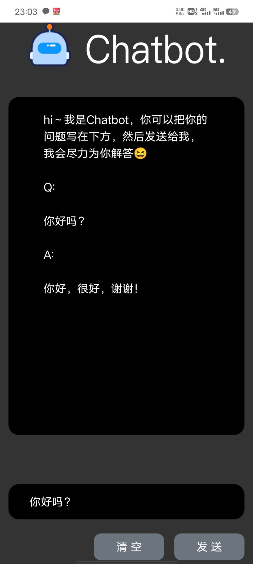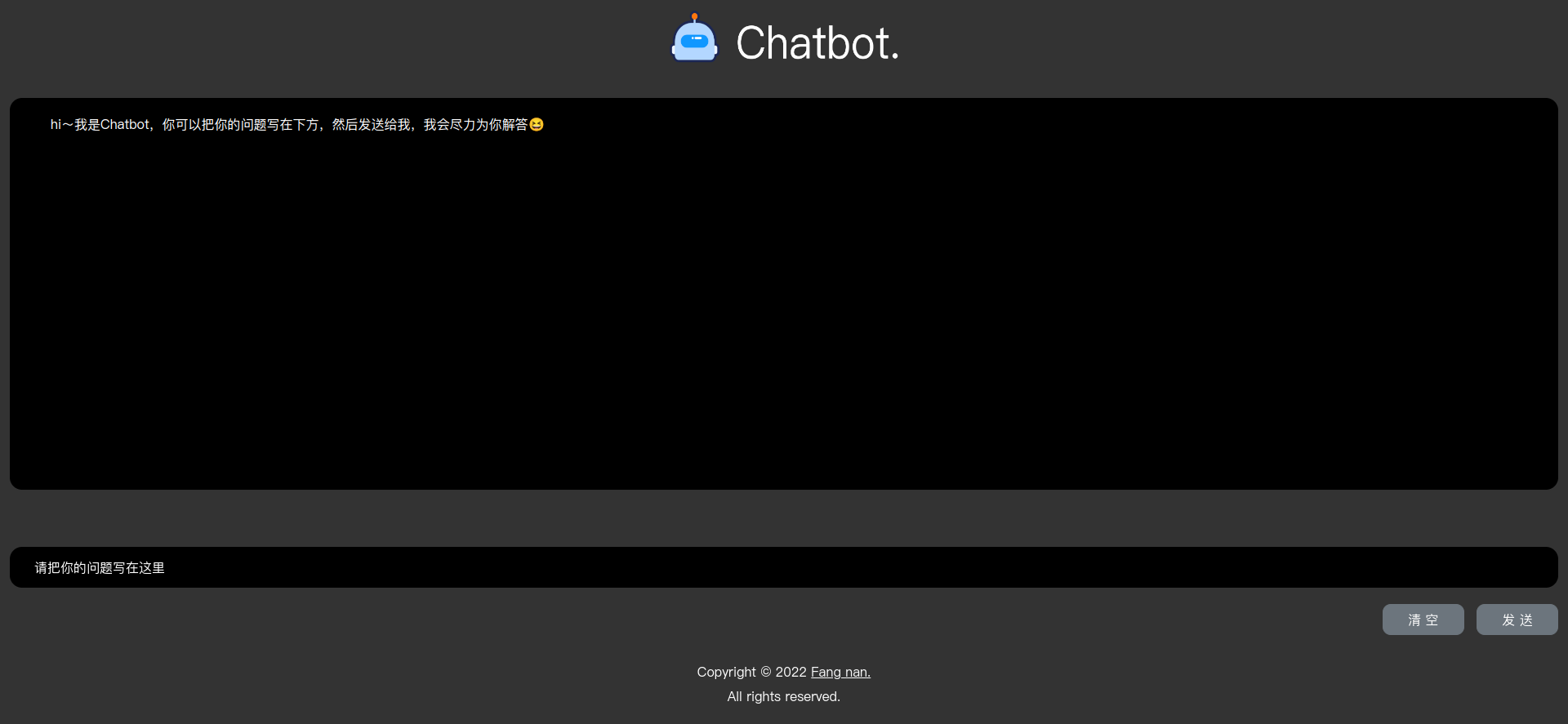 response.innerText = "hi~我是Chatbot,你可以把你的问题写在下方,然后发送给我,我会尽力为你解答😆"