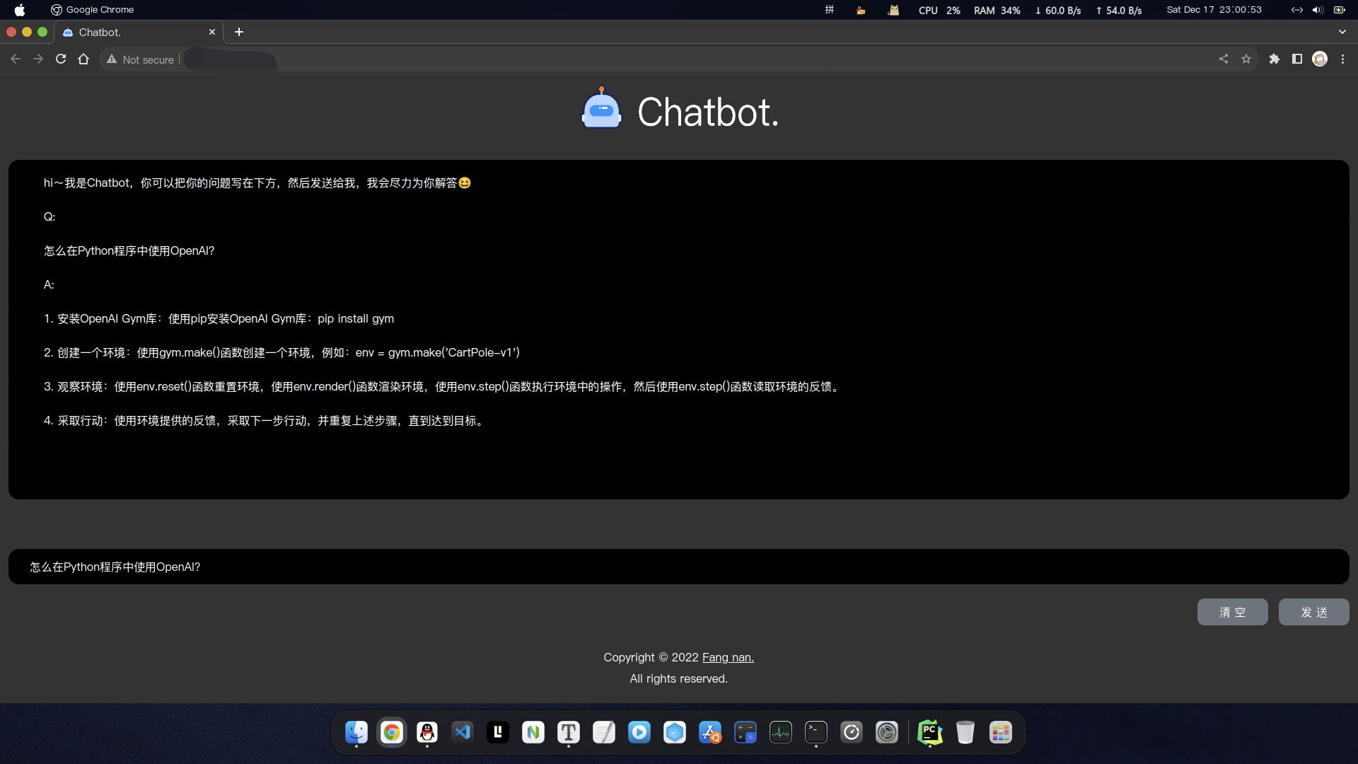 最近 ChatGPT 非常火,去体验之后确实有被惊艳到,也对 OpenAI 上的人工智能模型比较感兴趣,于是想着复刻一个 ChatGPT,利用官方提供的包和 api,可以非常简单地复刻出一个 ChatGPT,下面是复盘开发过程的记录。