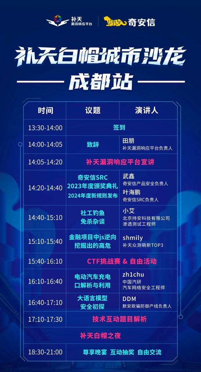 大概是上周三下午,我在某个安全交流群里看到了补天城市沙龙的消息,本来没怎么在意,毕竟在成都,离合肥一千多公里,而且兑换条件我也没有(挖的洞从来没在补天交过……)
