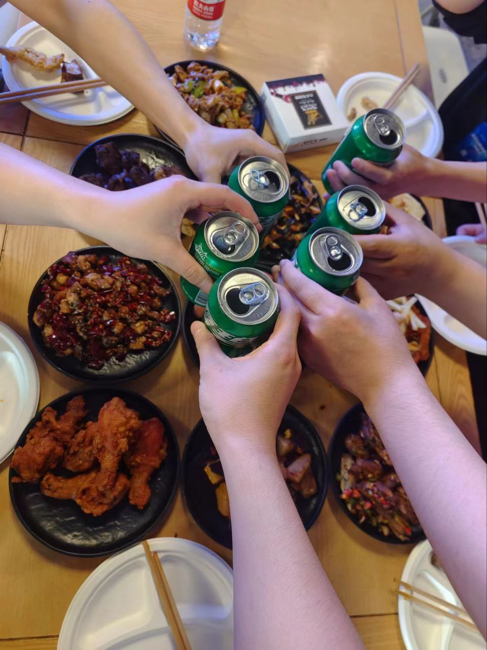 下午六点,运营小姐姐在群里说快开饭了,我们收到消息就马不停蹄地赶回了会场,抢在了入场第一位,等到开始入场,我们抢先占好位置,然后分工取餐,当别人还没找到位置时,我们已经摆满了一桌。