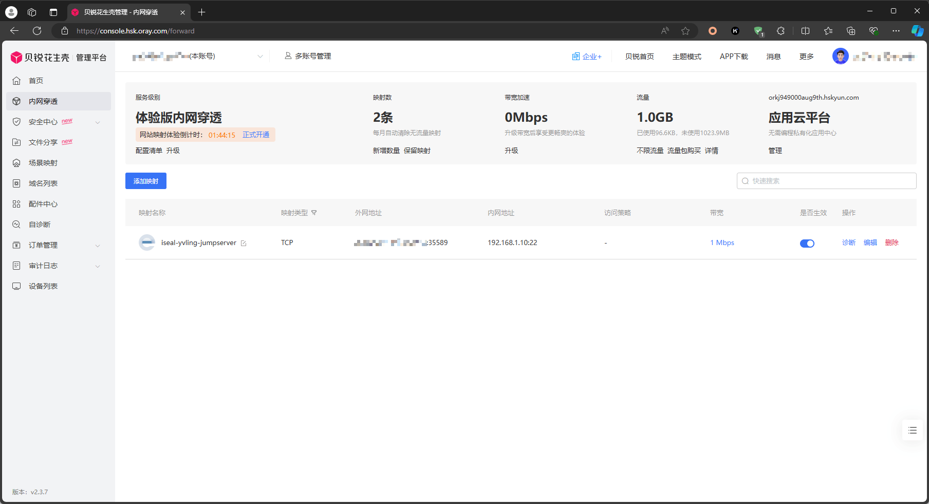 首先需要一台内网主机,这里我就直接使用了实验室的一台服务器,在上面使用花生壳来进行内网穿透,仅映射 SSH 出来即可,保证能从外网连接: