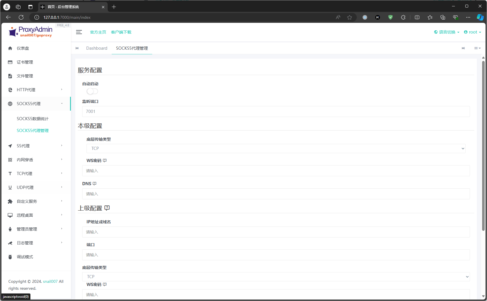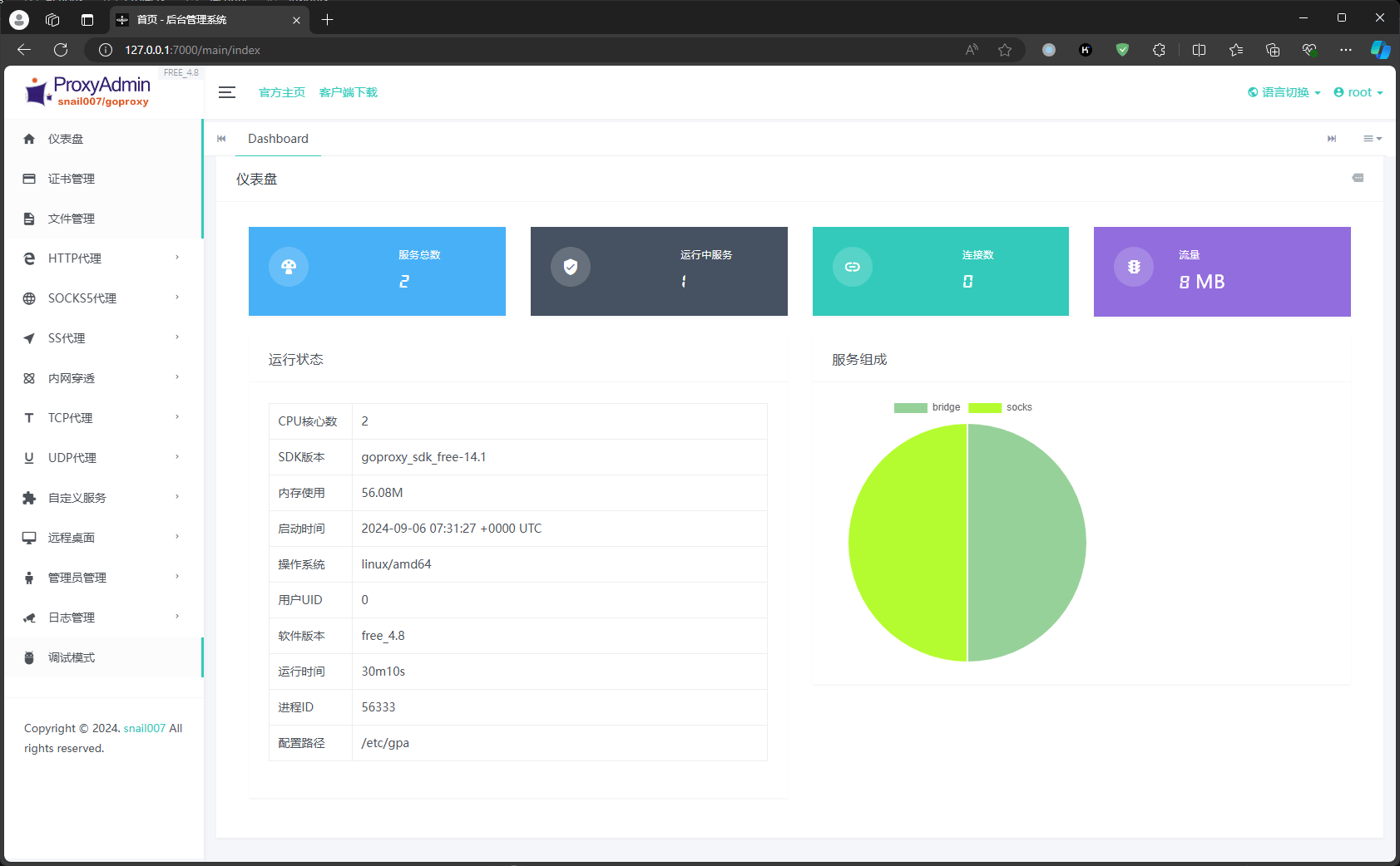 这里我选用的是 snail007/proxy_admin_free 来搭建,安装非常简单,直接从 Github 下载对应的可执行文件即可,例如 https://github.com/snail007/proxy_admin_free/releases/download/v4.8/proxy-admin_linux-amd64.tar.gz 。