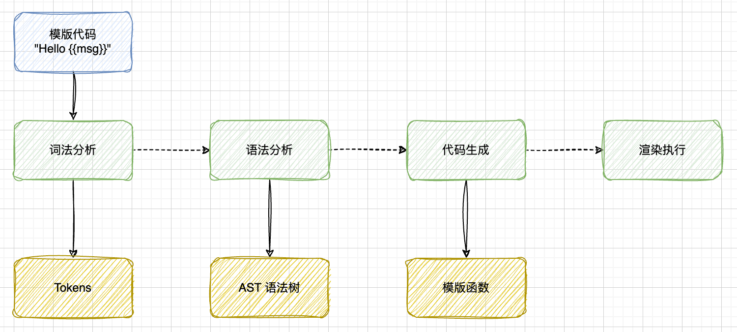 模板引擎实际上就是一个编译器,通过解析编写的模板语言,编译出新的 js 代码,然后再渲染执行。流程图如下: