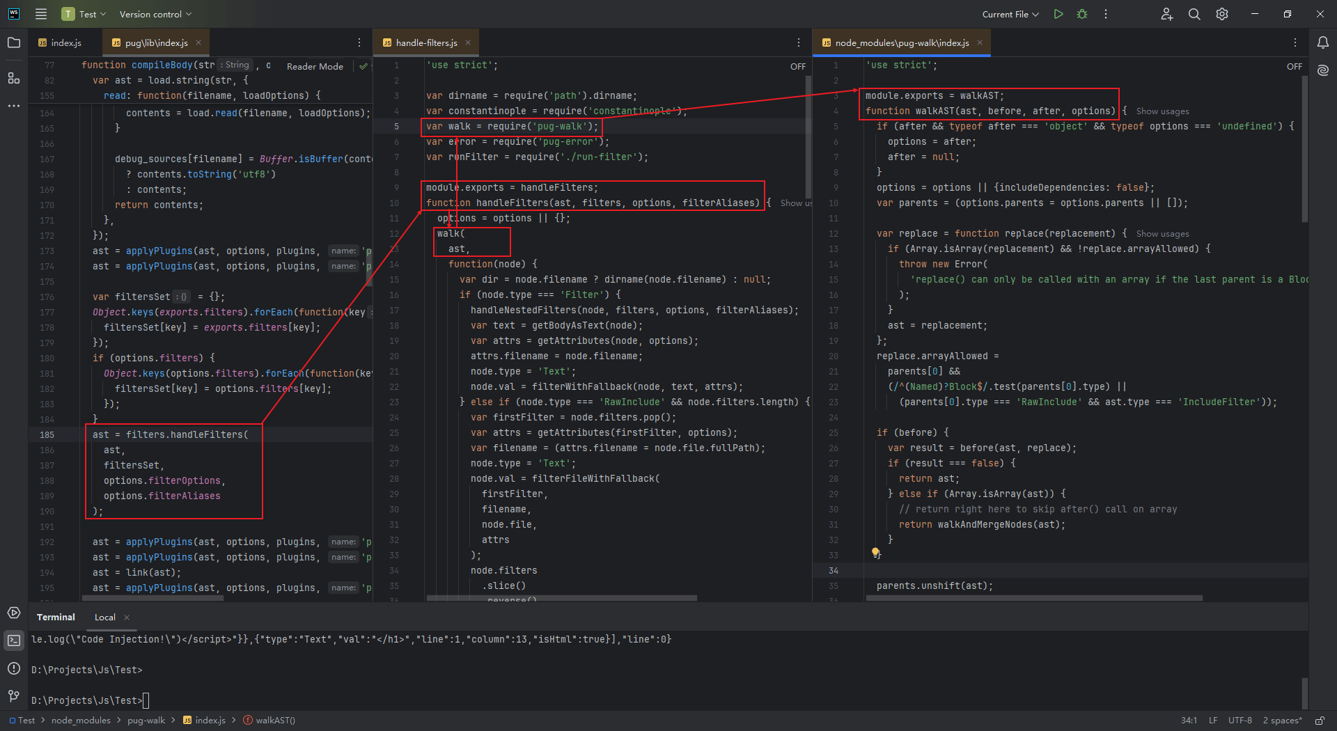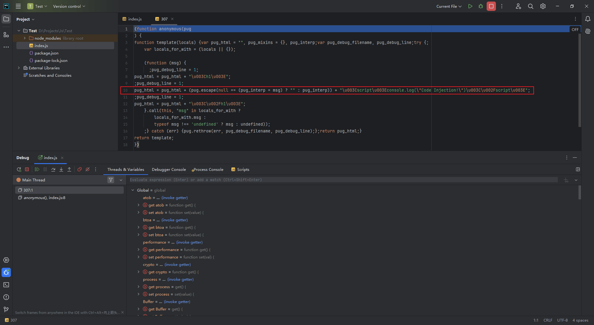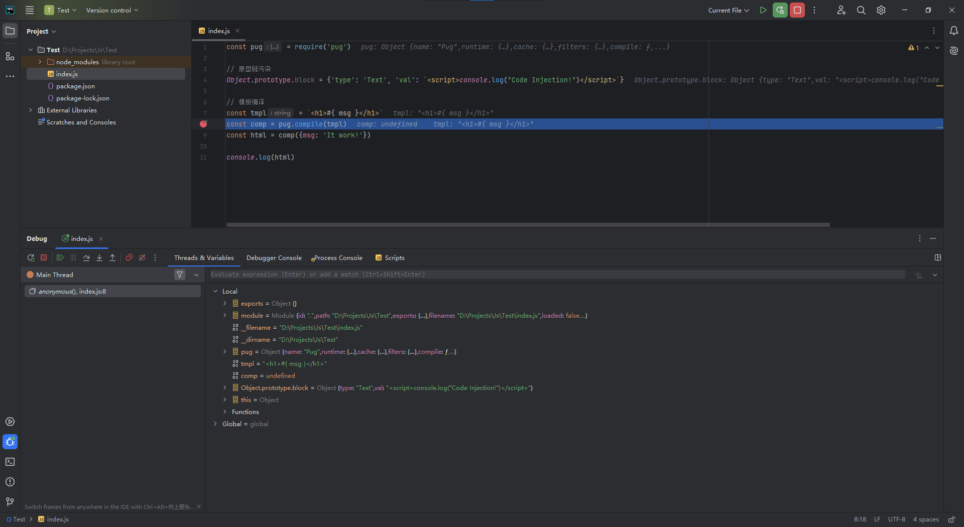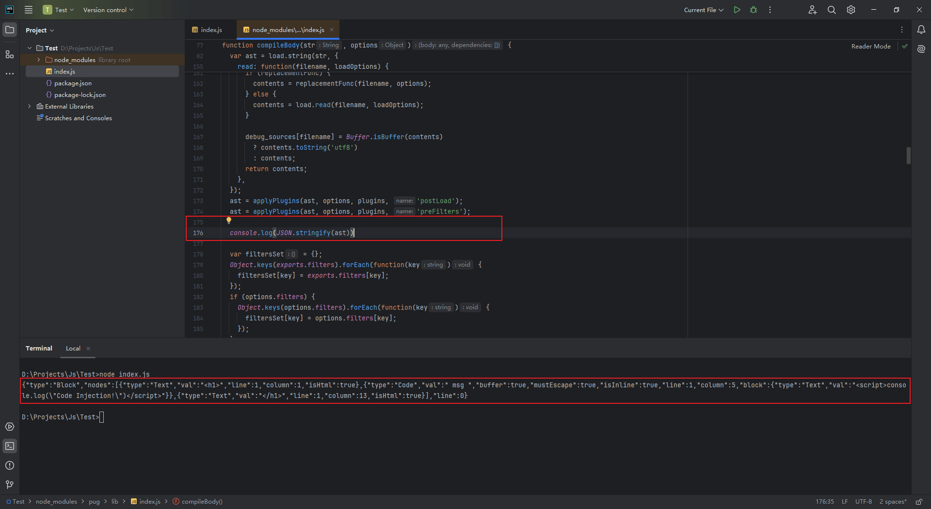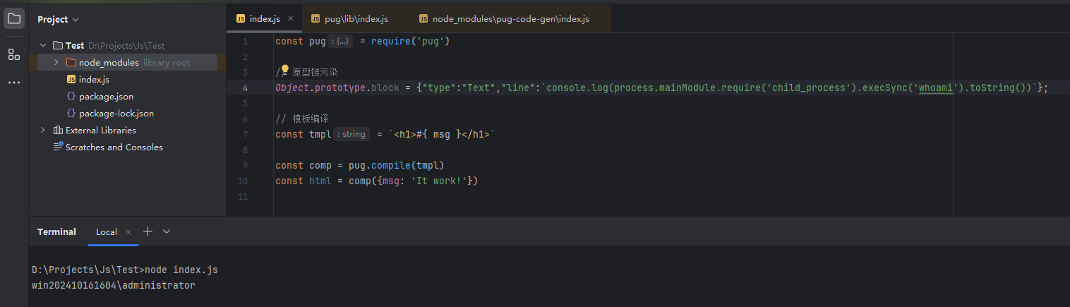 根据上面的分析,pug 模板引擎在编译生成 AST 树的过程中,可以通过原型链污染注入代码,如果能够通过构造注入 AST ,插入一个新的节点,使其成为新的 Js 代码,自然也就可以实现 RCE 了。