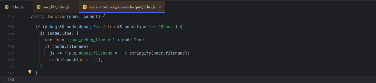 在 node_modules/pug-code-gen/index. Js #visit 中,存在以下代码: