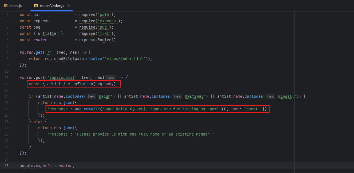 首先使用了 unflatten 来解析请求体中的参数,然后使用 pug. Compile 进行模板编译。