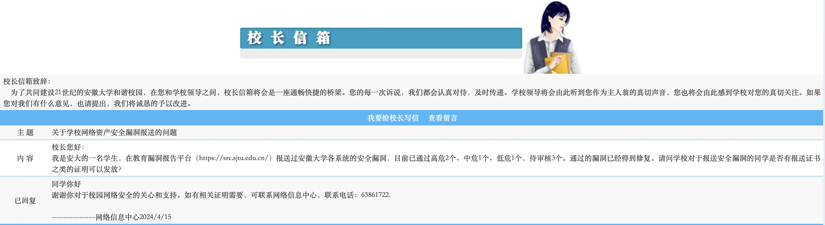 4 月份的时候,我已经在 edu src 提交了很多我们学校的风险漏洞,但因为我们学校并没有在平台上发放漏洞报送证书,我又非常想要一张,所以抱着试一试的态度,我在学校的校长信箱上留了这么一封邮件:
