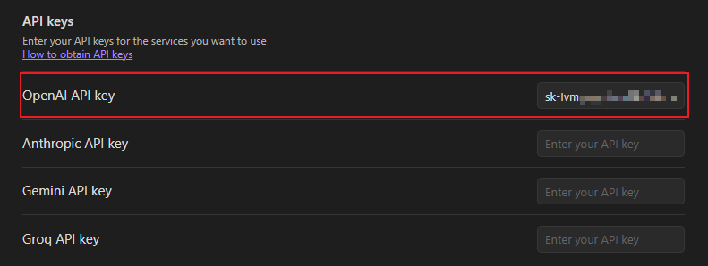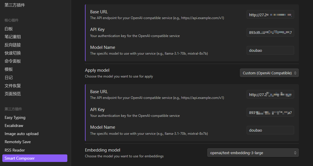 然后在 Smart Composer 的设置中填写对应的 API 密钥: