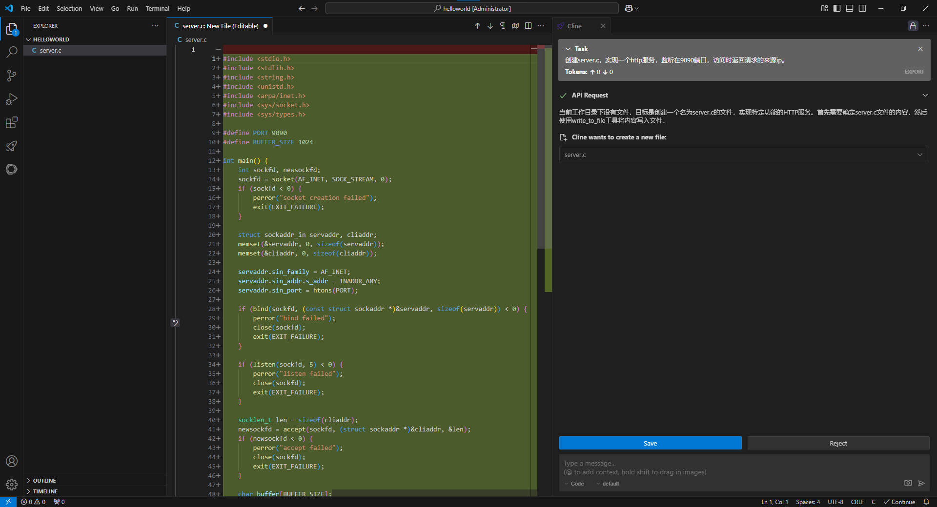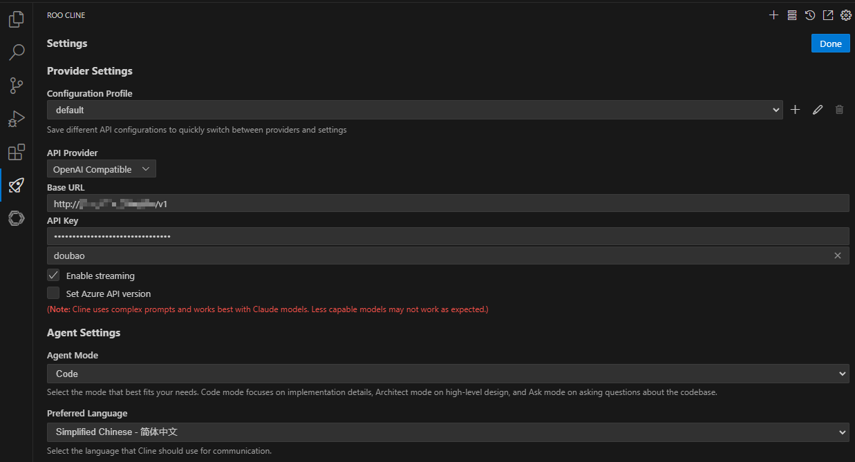 使用 Roo Cline 插件,结合大模型就能实现类似于 Cursor 的自动编码功能,配置也比较简单,继续使用刚搭建的豆包 API。