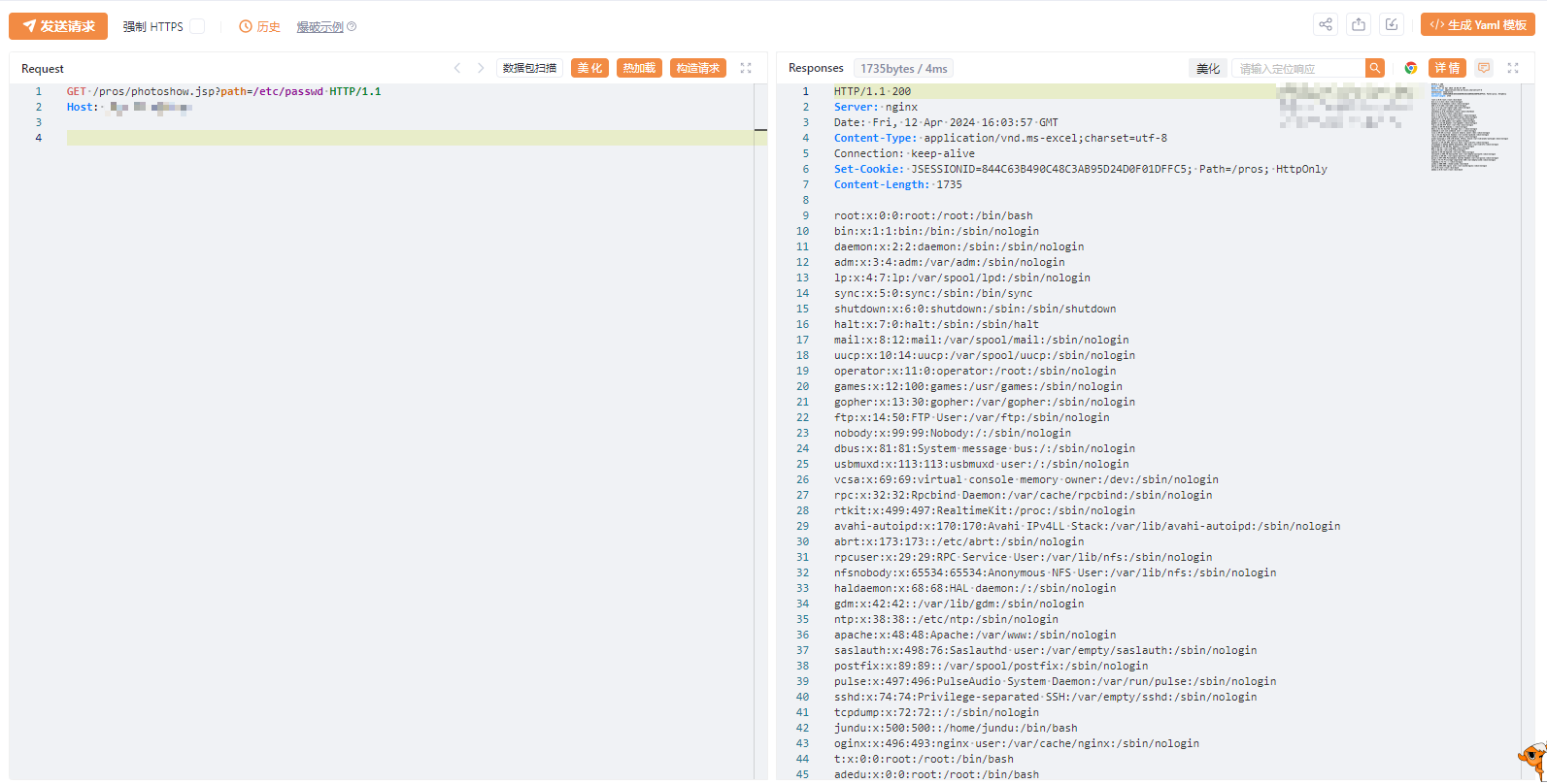 根据名称,猜测该接口传入某图片路径,用于展示该图片,遂测试传入任意文件路径,尝试读取 /etc/passwd: