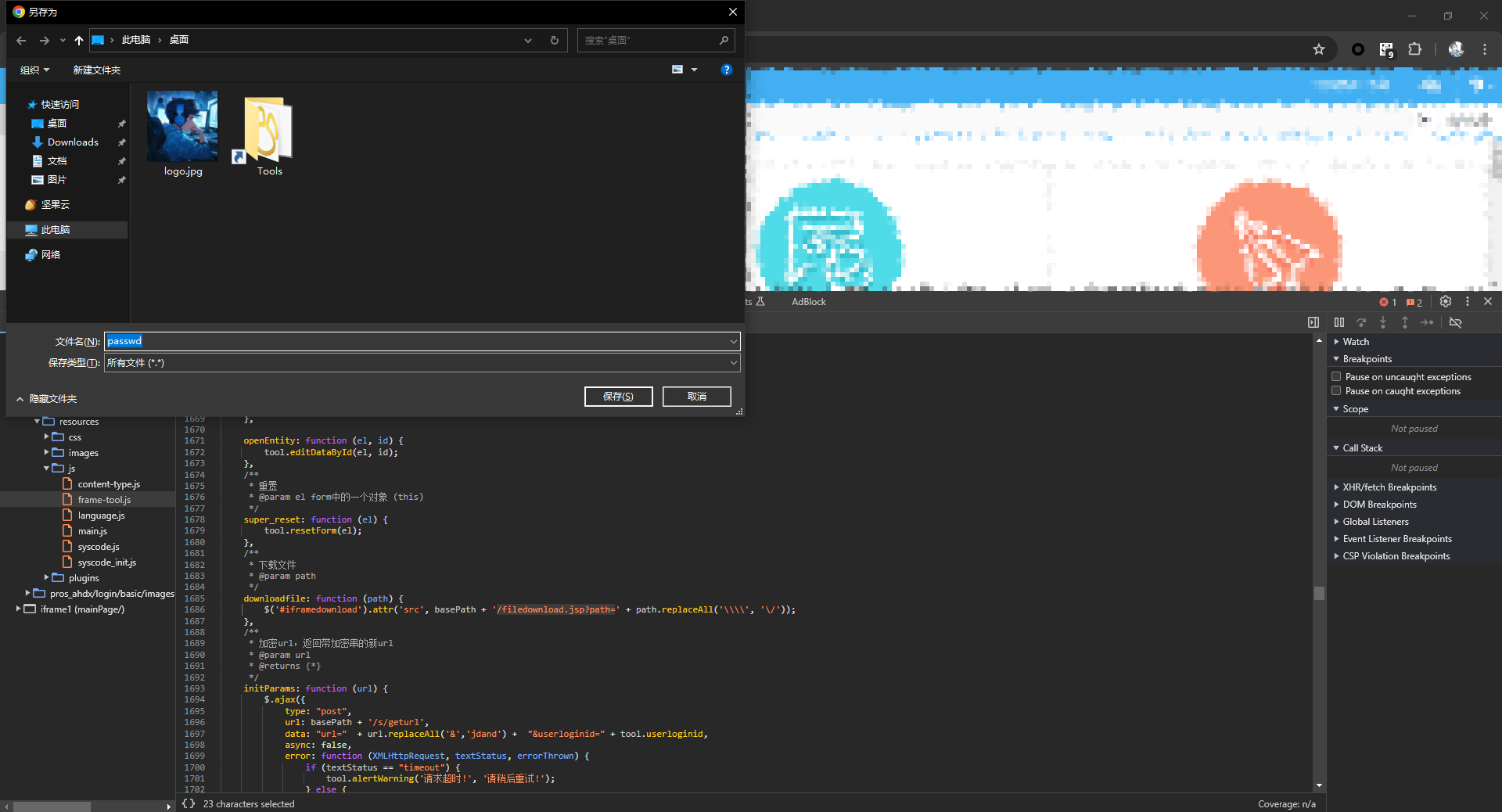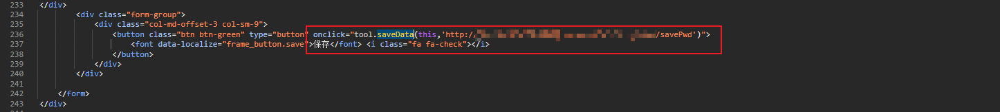 查看 html 代码发现,当提交修改密码的请求时,调用了 tool.saveData() 这个函数,并传入当前对象和一个 api 接口地址。