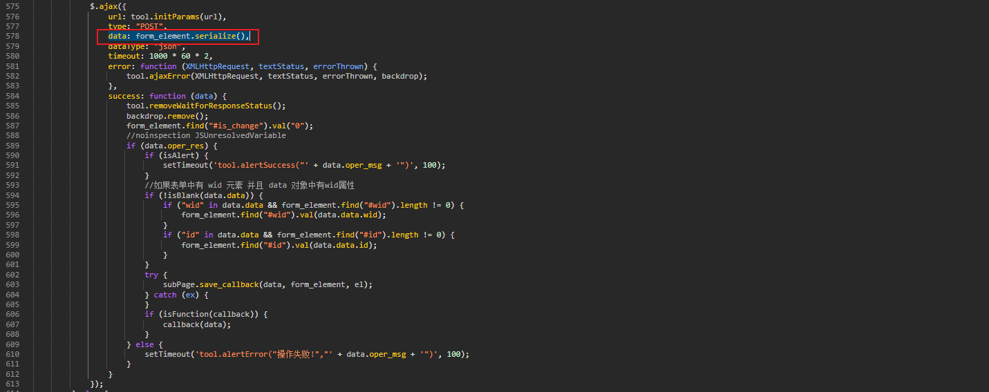 跟进 tool.saveData() 函数,其内部调用了一次 $.ajax() 来发送请求,注意到发送请求时,data 参数是只携带了待修改用户的身份证号和新密码,并未携带鉴权信息!