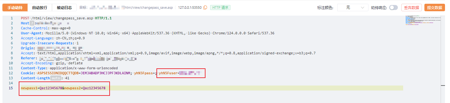 使用当前帐号进行修改密码操作,输入新密码 Qaz12345678,拦截数据包:
