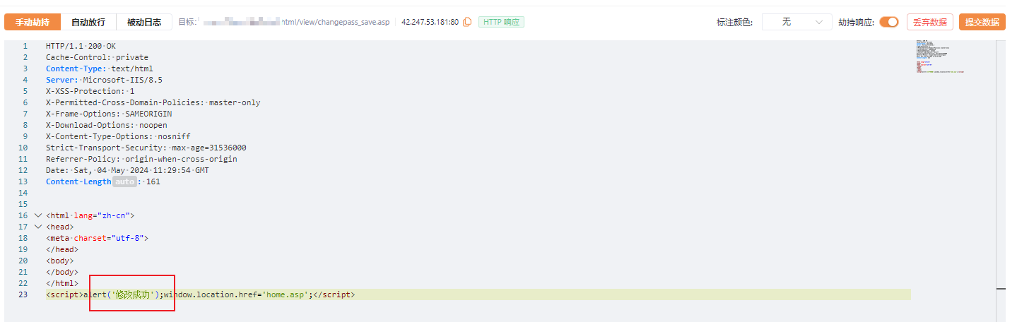 修改数据包中的手机号为账号 2 的手机号,放行,提示修改成功: