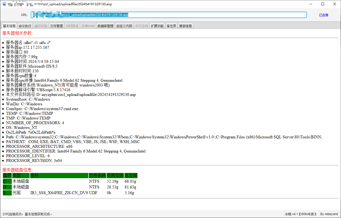 所以顺带着生成了个小马,上传一手,冰蝎连接,轻松秒杀。