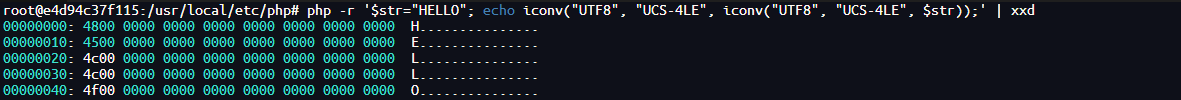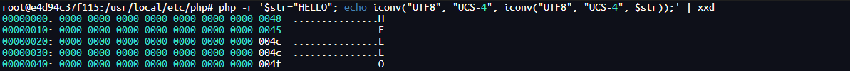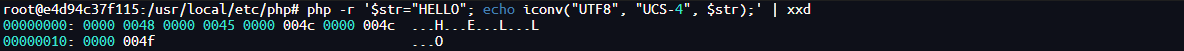 php -r '$str="HELLO"; echo iconv("UTF8", "UCS-4", iconv("UTF8", "UCS-4", $str));' | xxd
