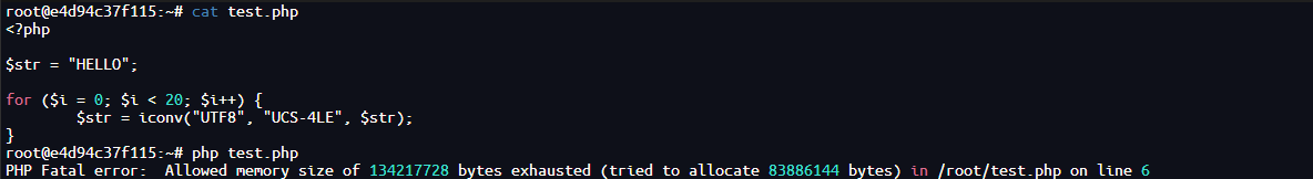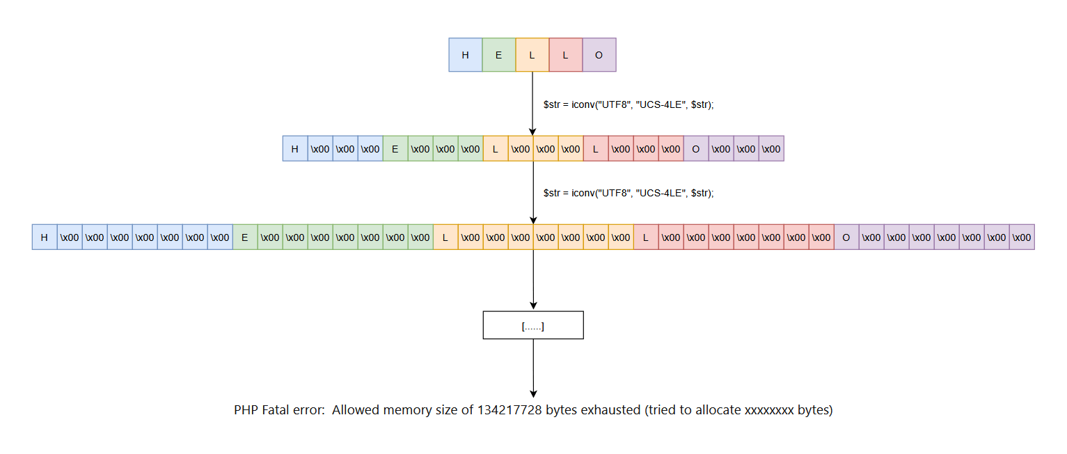 简单来说,iconv 函数可以将字符串由一种编码转换为另一种编码,并且它可以被 php://filter 调用。又因为有些编码在转换过程中能够产生复制字节的效果(如 UNICODE 和 UCS-4),所以结合起来重复调用,就可以将字符串的字节数不断增大,直到导致溢出,引发错误。
