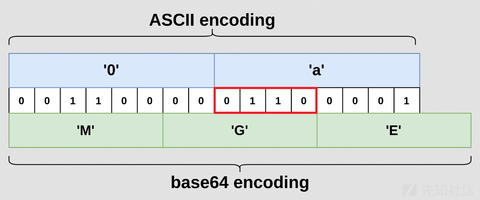也就是说,数字的前导字符只可能是 M、N 或 O ,而根据 base 64 的编码规则,第二位字符要取决于数字之后的一个字符:对于给定的数字,只有后面字符的前四个字节将决定第二个 base 64 字符。