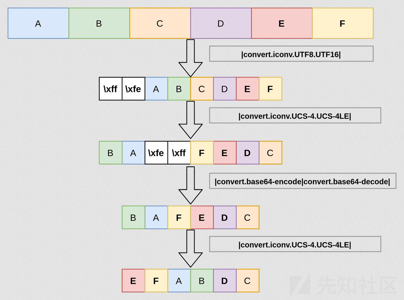 通过生成两个字节的数据,然后使用 UCS-4 LE 编码使原字符串倒置,最后删除之前添加的数据,达到将非前向字符移动到前向字符的位置,再进行识别的目的: